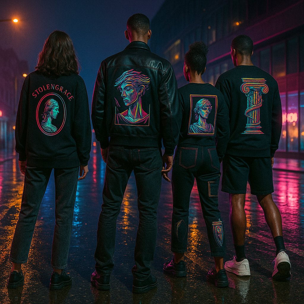 Sieh, wie rohe Skizzen zu sakraler Streetwear verschmelzen, wie jede Naht Erinnerung bewahrt und jeder Patch Stolz schreit.